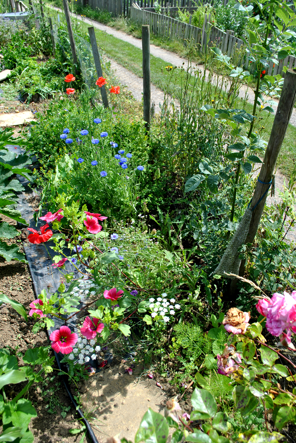 Lastly the slightly random flower border we sowed with a sprinkling from one of those shake-n-sow boxes you can pick up for a couple of quid has started to bloom. We perhaps over crowded it a tad but it's starting to look nice and bright and surely attracts some nice insects to the plot.